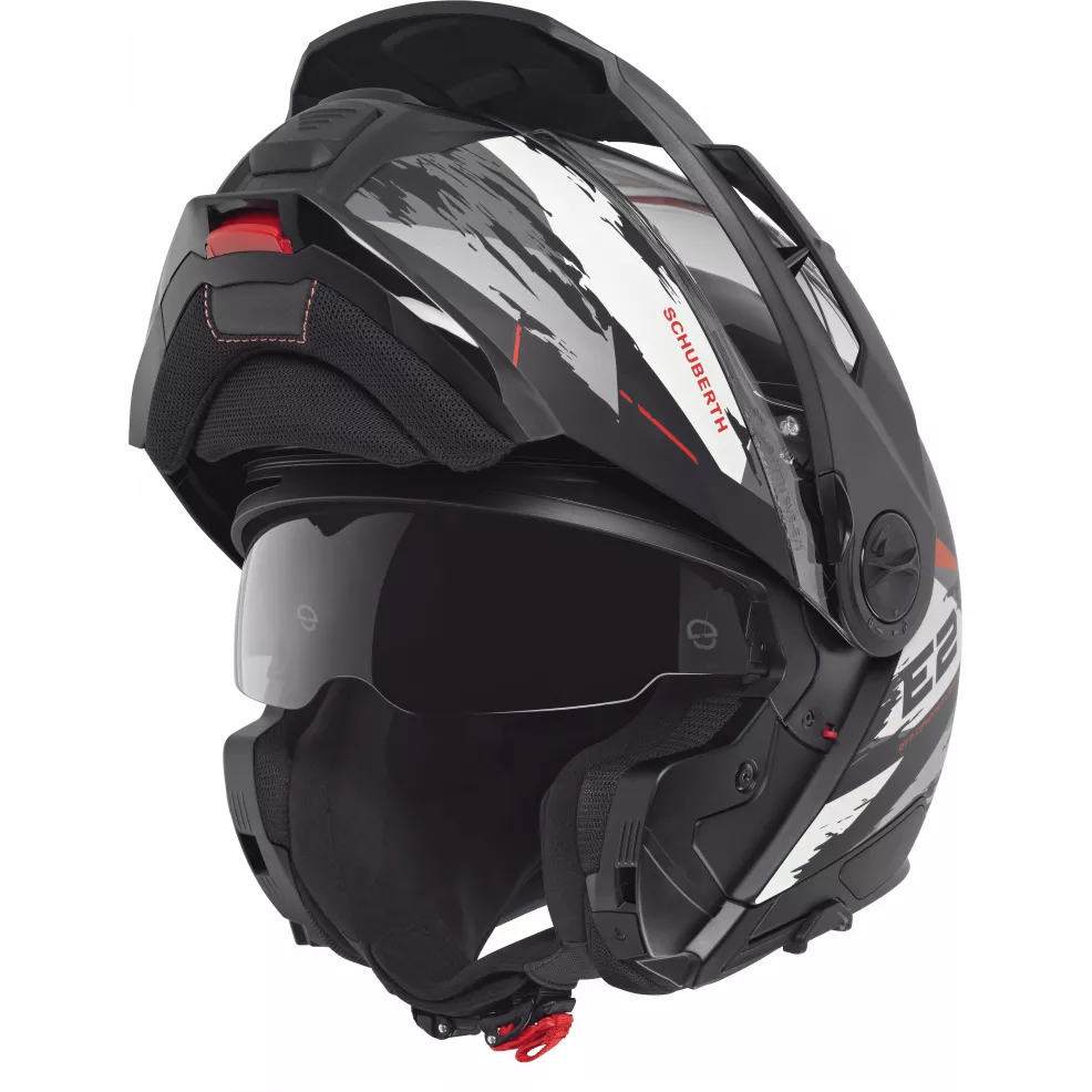 Come tutta la gamma SCHUBERTH, anche E2 beneficia del sistema Anti-Roll-Off collegato ai cinghioli riposizionati più avanti rispetto all'alloggiamento tradizione, per garantire un maggiore comfort nella zona della gola.